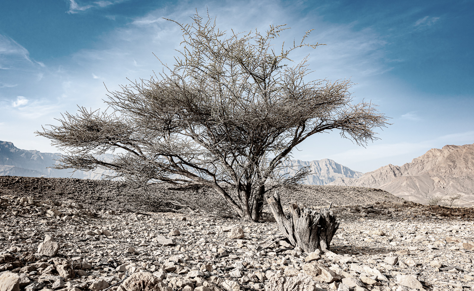 Acacia Tree in a arid desert area,Mounbtains of th Sultanate of Oman
