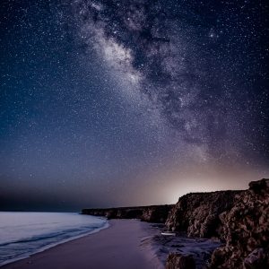 A serene fine art capture of a half moon glowing in a dark, empty night sky.